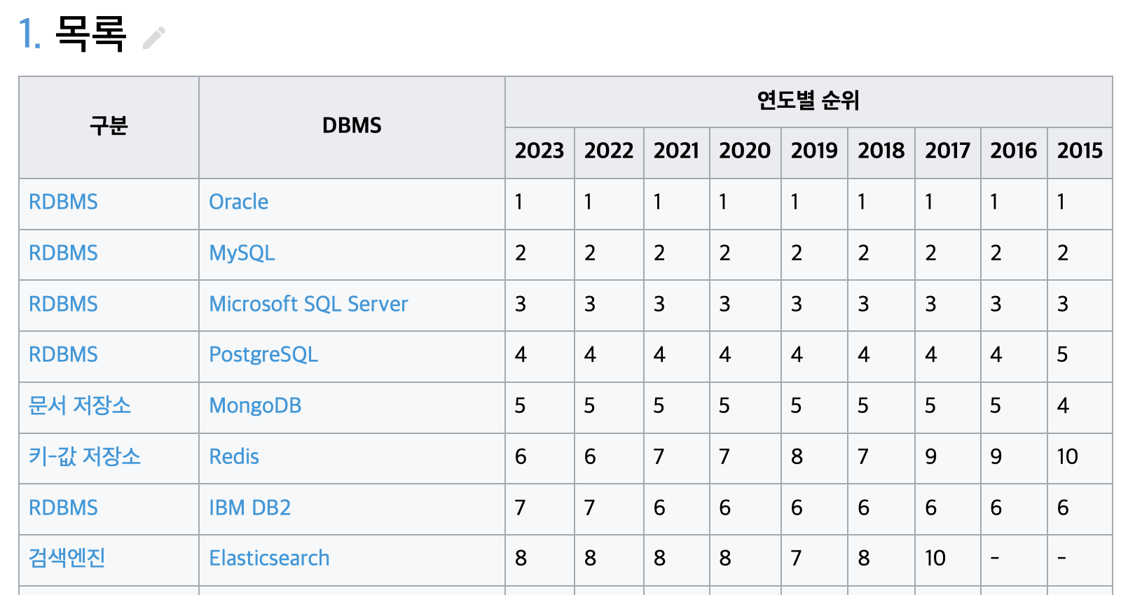 검색 엔진 중에서도 최근 가장 유명해진 엘라스틱 서치는, 아래 그림과 같이 데이터베이스 랭킹에서도 상위 순위를 차지하고 있습니다.