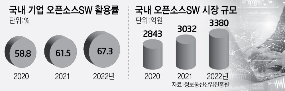 국내 기업의 오픈소스SW 활용률은 매년 높은 상승률을 보여주어 2022년에는 거의 70프로에 달하는 수치를 보여주고 있습니다.