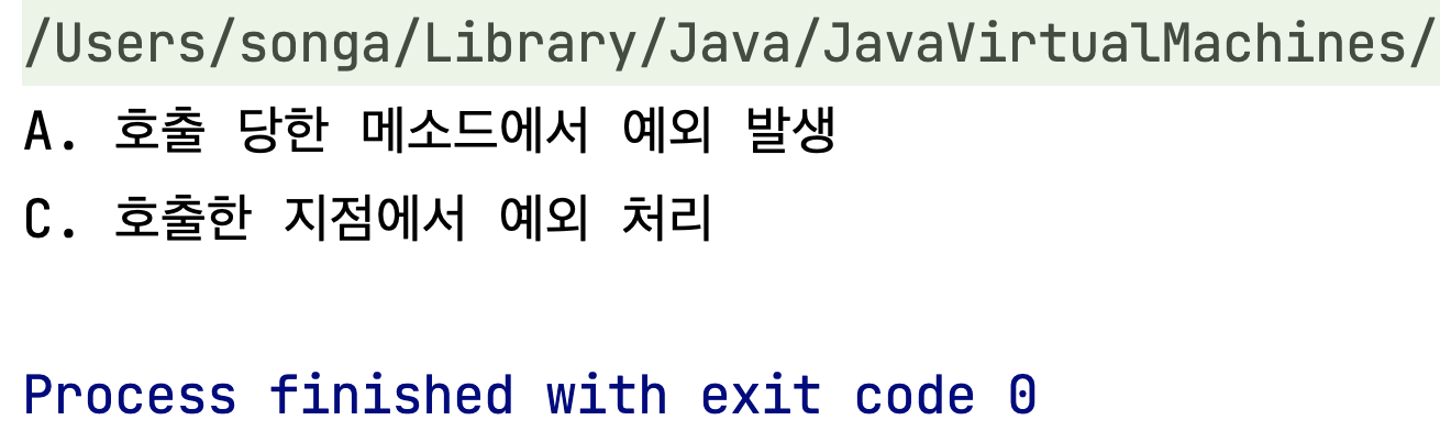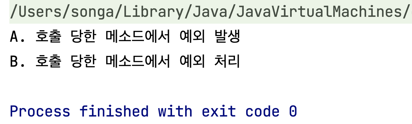 실행해보면, 다음 결과와 같이 호출 당한 메소드 안에서 ✔️예외 발생과 ✔️예외 처리 둘 다 해결했네요!
