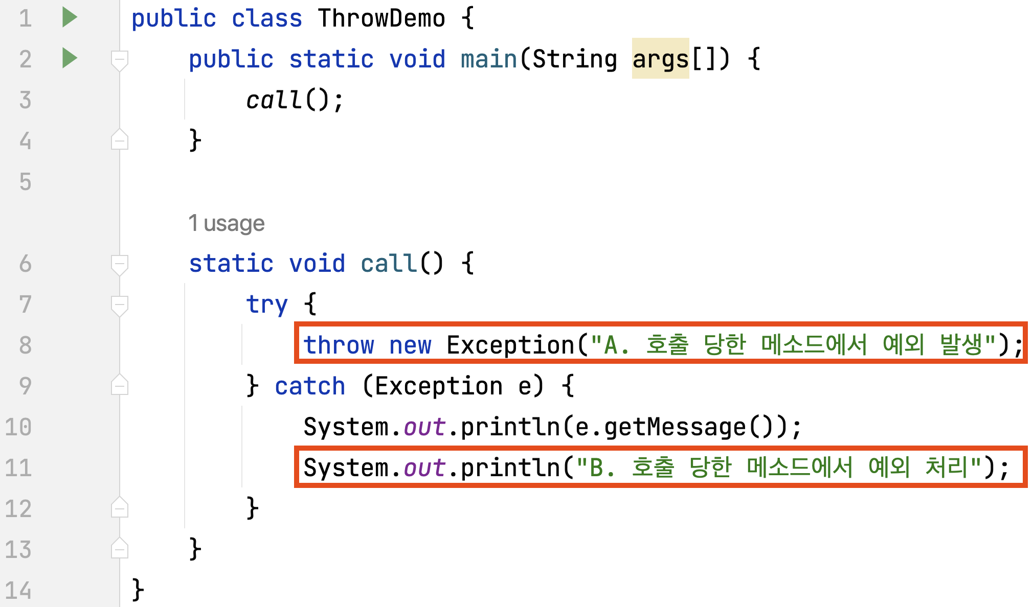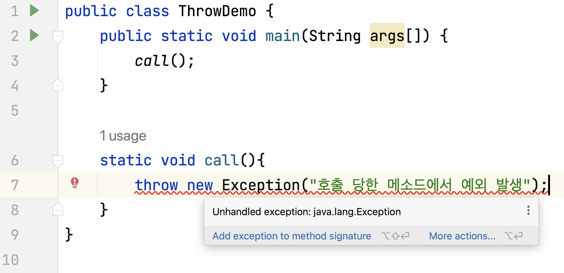 main메소드에서 호출할 call()이라는 메소드를 만들고, 그 메소드 안에서 예외를 터트려보죠.