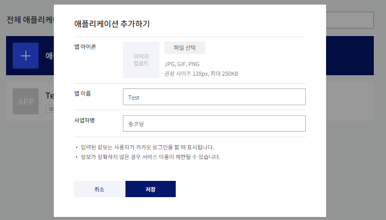 (1) https://developers.kakao.com/ >> 내 애플리케이션 >> 애플리케이션 추가하기 (앱 이름, 이름)