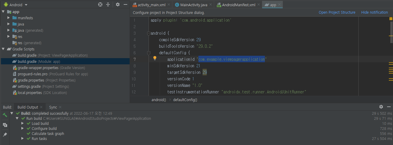 applicationId "com.example.viewpagerapplication" // 패키지명은 바꿔줘야한다!