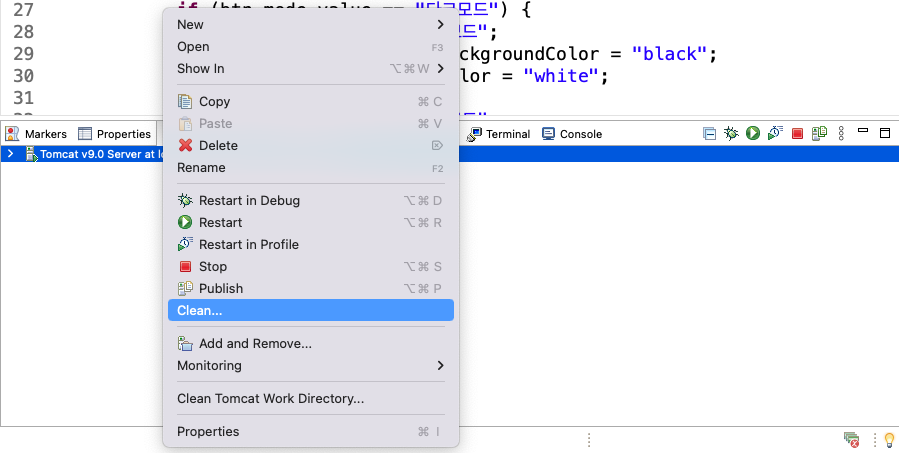 서버 탭에 사용중인 서버 마우스 오른쪽 버튼 클릭 > Clean