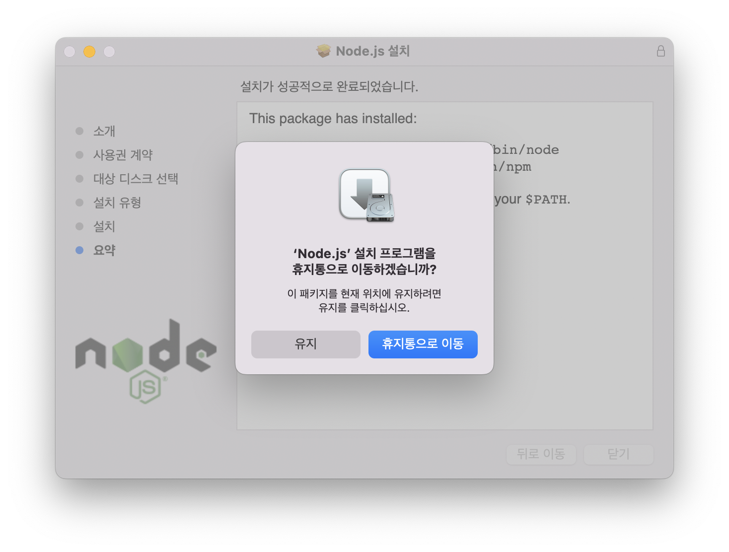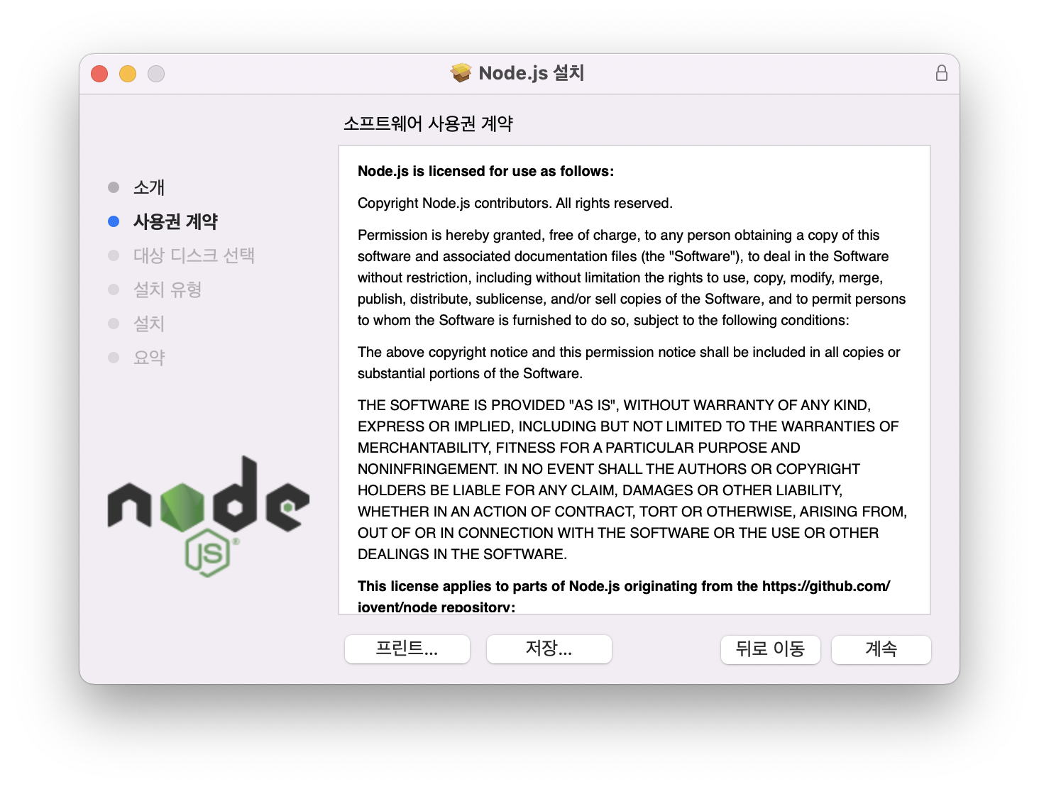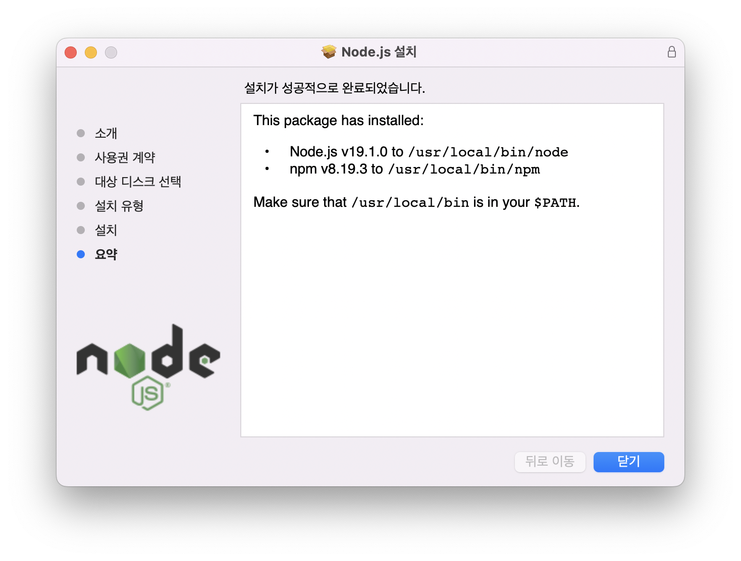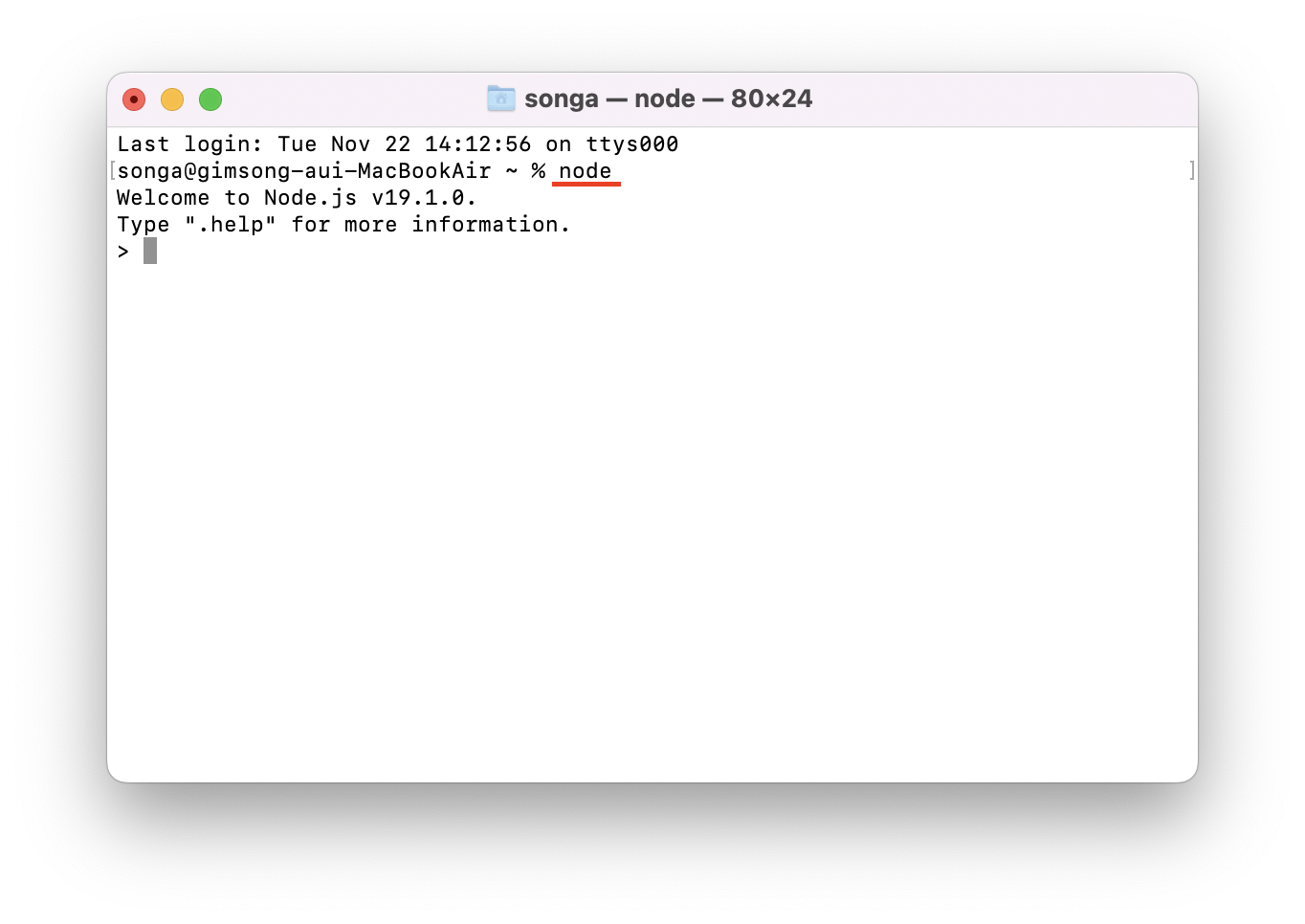 4. 설치 완료 : 터미널 실행하여 node.js 실행 명령어(node) 입력