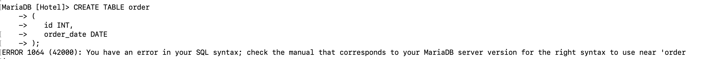 ERROR 1064 (42000): You have an error in your SQL syntax; check the manual that corresponds to your MariaDB server version for the right syntax to use near 'order' at line 1.
