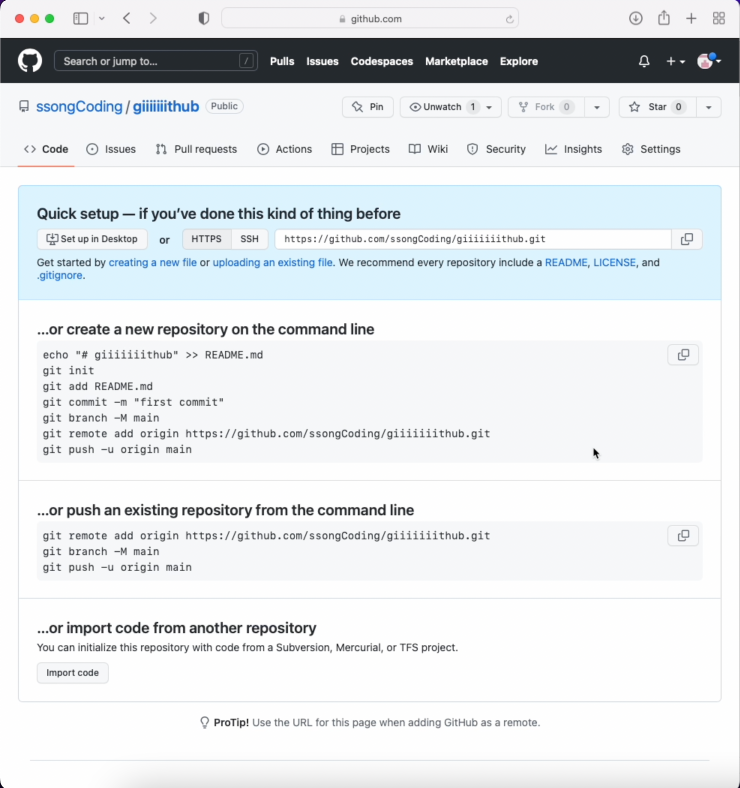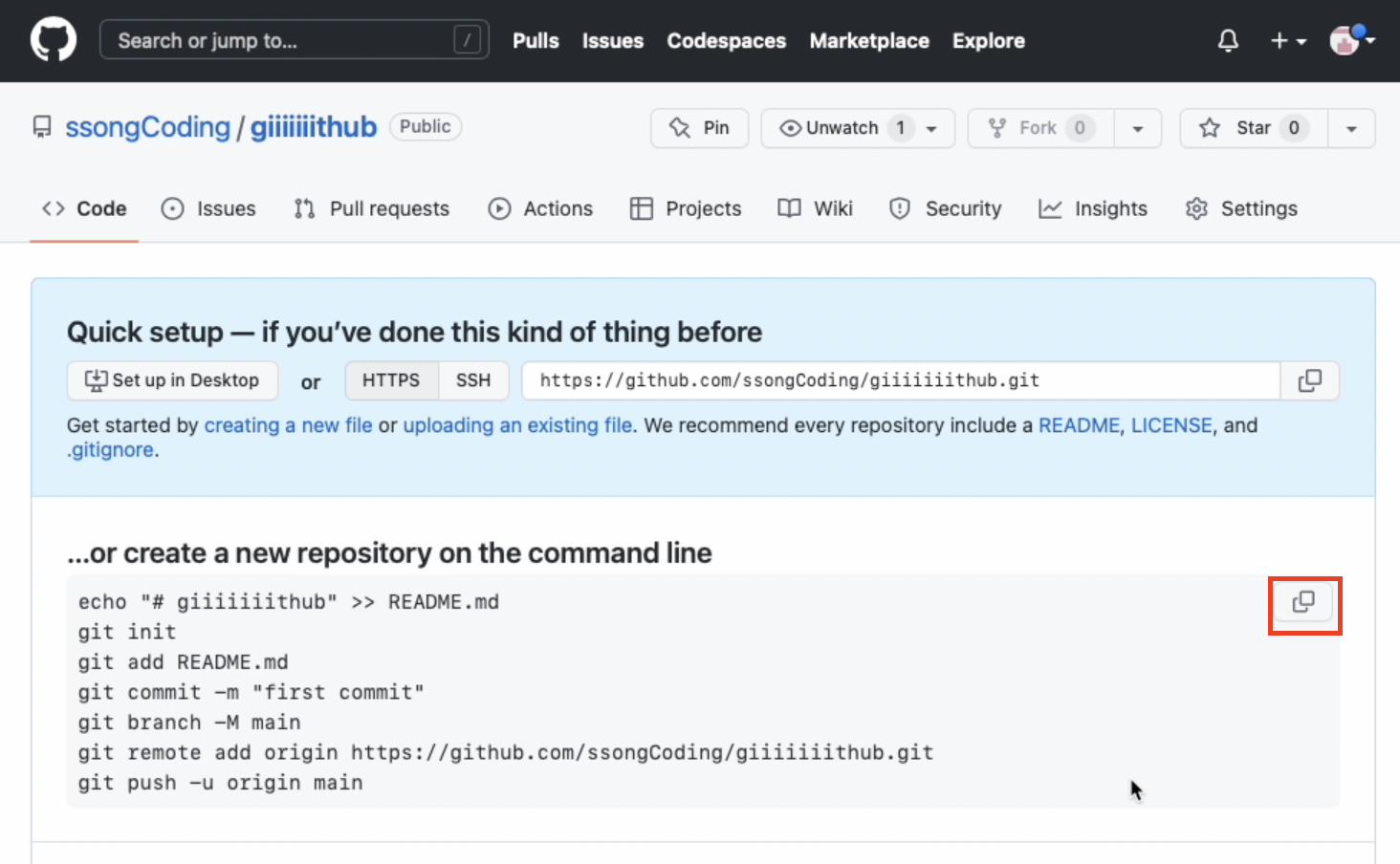 3. 빨간 네모 누르기 (프로젝트에 레포지토리 생성 및 연결용 명령어 복사~~)