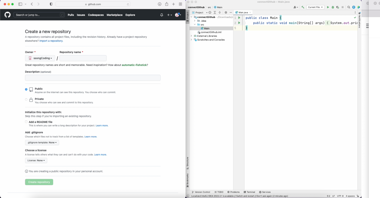 안녕하세요~~ 송아지할때송아 김송아입니다 오늘은 진심 30초만에 깃허브와 인텔리제이를 연결해보려합니다! 야호!🎉 진짜 되나 싶죠? 🤔 솔직히 복붙만 할 줄 알면 다~~ 된답니다. 그럼 빠르게 가보죠! (4단계이긴 한데 30초 걸림..) 1. 왼쪽엔 깃허브 오른쪽엔 깃허브에 연결을 원하는 인텔리제이 프로젝트를 켭니다. 2. 깃허브 레포지토리를 생성합니다! (이름은 프로젝트랑 달라도됨 주의) 3. 빨간 네모 누르기 (프로젝트에 레포지토리 생성 및 연결용 명령어 복사~~) 4. 인텔리제이 하단에 있는 '터미널' 에 붙여넣기하고 엔터 치면 끝! 혹시 커밋이랑 푸쉬도 필요하신 분들은 3분짜리 영상으로 만들어두었으니 참고하세요~~~~ 그럼 20000!!! 좋은 하루 되세요😊 감사합니다. 김송아 드림