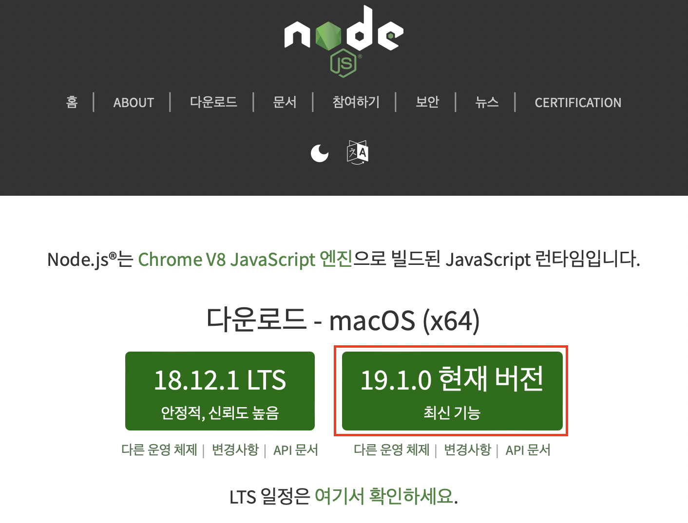 MacOS의 경우, 사용할 프로그램의 버전/패키지 관리를 위해 homebrew(패키지 관리자)를 이용하여 프로그램을 설치하는 것을 권장한다고도 합니다. 관심있으신 분들은 homebrew를 이용해 설치해보시는 것도 추천드립니다. 관련 블로그 : https://ooeunz.tistory.com/5 (그렇다고 저처럼 다운로드 받는 것이 안 된다는 것은 아닙니다!) 1. nodejs 다운로드 사이트 접속 https://nodejs.org/ko/ Node.js Node.js® is a JavaScript runtime built on Chrome's V8 JavaScript engine. nodejs.org 2. 자동으로 OS 버전에 맞게 셋팅된 다운로드 버튼 클릭 3. 다운로드 받은 패키지 실행 4. 설치 완료..